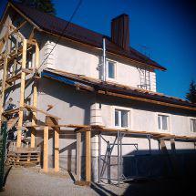 Дом с мансардой и террасой из бруса 150х200 с прострожкой по фасаду.