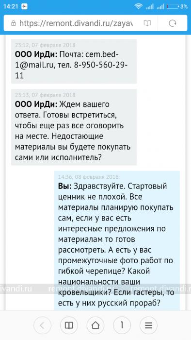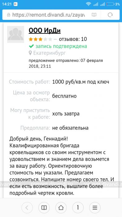 Выставил я свой объект кровлю 200м2 гибкой черепицы + доп работы, получил заманчивое предложение от ООО ОрДи с хорошим ценником, но после моей просьбы выслать фото работ в том числе с промежуточными этапами работ, которые они осуществляли по гибкой черепицы я на свою почту получил с десяток фотографий из интернета) тупо заведённых в яндексе по запросу фото работ видимо))) и пояснение что во всех представленных фотографиях с объектами участвовали исключительно их монтажники и что у меня будут работать они же))) я почему то за сомневался, так как многие фотографии я уже видел на официальных сайтах производителей и продающих организаций гибкой черепицы, находящихся в разных городах России матушки, а тут щёлк и они у меня на крыше))) вобщем после долгого изучения и общения с другими бригадами я понял что ООО ОрДи абсолютно не имеет ни какого отношения к строительству, а так посредники, предлагающие объекты не важно кому, не парясь за качество, которые даже своей фото галереи не имеют, ну и отзывы говорят сами за себя. Я лично отписался директору этой организации по поводу фоток и что я ищу реальную бригаду, а не фотки из интернета, но ответа не получил))) Но есть на этом сайте и порядочные люди, даже простые частные бригады представленные на этой площадке гораздо информативней.