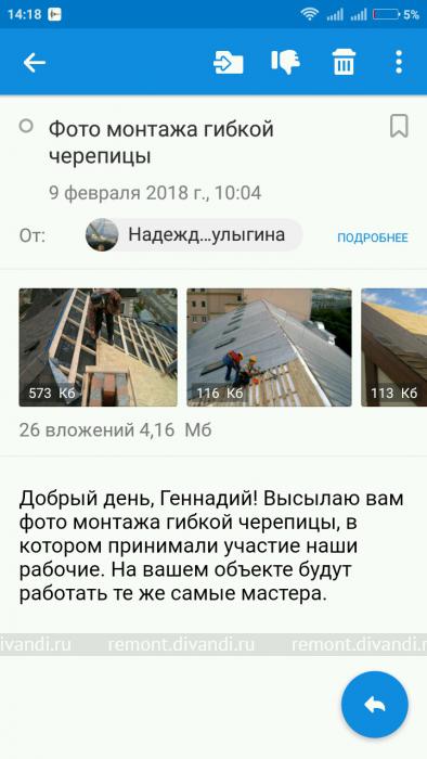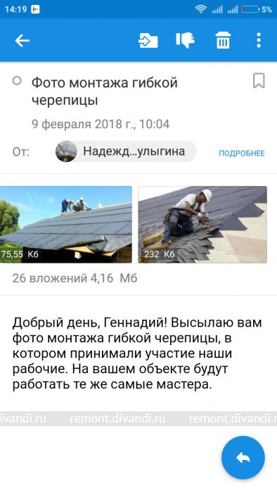 Дело в том, что сейчас все строительные компании сократили своих рабочих, и все рабочие-специалисты в настоящее время работают на договоре, т.е . как говорится «на вольных хлебах» и поэтому сотрудничают сразу с несколькими строительными фирмами. Поэтому может получиться так, что Вы обратились в одну строительную компанию, Ваши знакомые – в другую компанию, а третий заказчик обратился к частной бригаде. А по факту это может получится так, что все три заказа выполнит одна и та же строительная бригада, которая самая опытная и со своим инструментом. Таких бригад в нашем городе не так уж много, и все они на хорошем счету у многих строительных компаний, поэтому зачастую разные фирмы, заключая договор с заказчиком, приглашают на работу одних и тех же специалистов. . . А что касается высланных вам фото из интернета, это, конечно, неправильно, и досадно, что при ответе менеджера Вам высветилась наша компания и фамилия директора. Я уже поговорила с менеджерами, чтобы каждый из них зарегистрировал свою личную почту, ( хотя к этой нашей второй дополнительной почте уже все привыкли и она давно на слуху у многих рабочих и других строительных компаний). Менеджер, высылая Вам не свои фото, вовсе не пыталась обмануть Вас. Просто, видимо, у нее на тот момент не оказалось фото по монтажу именно гибкой черепицы, но она понимала, что с нами сотрудничают две большие бригады опытных кровельщиков-универсалов, которые сумеют грамотно выполнить Ваш заказ, чтобы Вы остались довольны. А когда писала Вам ответ, видимо, не дозвонилась до старшего бригадира. Поэтому и выслала Вам другие фото. Конечно, она очень перестаралась, достаточно было отправить 2-3 фото. . И еще скажу Вам один нюанс: архив фотографий у рабочих бригад, как правило, у каждой свой. И не всегда они охотно делятся этими фото со строительными компаниями, чаще всего они демонстрируют свою работу уже непосредственно перед заказчиком. Так что если бы мы взялись за монтаж Вашей кровли, то Вы бы на месте увидели фото выполнения подобной работы именно этой бригадой. Фото выполнения работ для каждой бригады – это собственный имидж и своеобразная реклама именно их работы, которая также конкурирует с другими бригадами, поэтому, как правило, свои фото они дают посмотреть только заказчику, чтобы этими фотографиями не воспользовались их конкуренты, т.е. другие бригады. . . Так что Геннадий, приносим Вам извинения, что так получилось. Кстати, если Вы уже определились с исполнителем или когда определитесь, поинтересуйтесь у строителей, работали ли они когда-нибудь с компанией ООО ИрДи, и я уверена, что почти за 10-летний стаж нашего существования эта бригада, которую Вы выберите, хотя бы 2-3 раза работала с нами, т.е. от имени нашей фирмы, создавая нам своеобразный уровень качества и конкурентноспособность на строительном рынке. Такой же уровень качества и конкурентноспособность квалифицированные бригады создают и для других строительных компаний, т.к. подчеркиваю еще раз: своих штатных строителей компании уже давно не имеют.