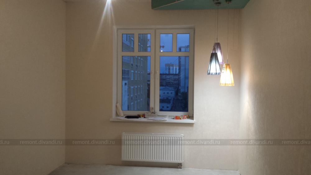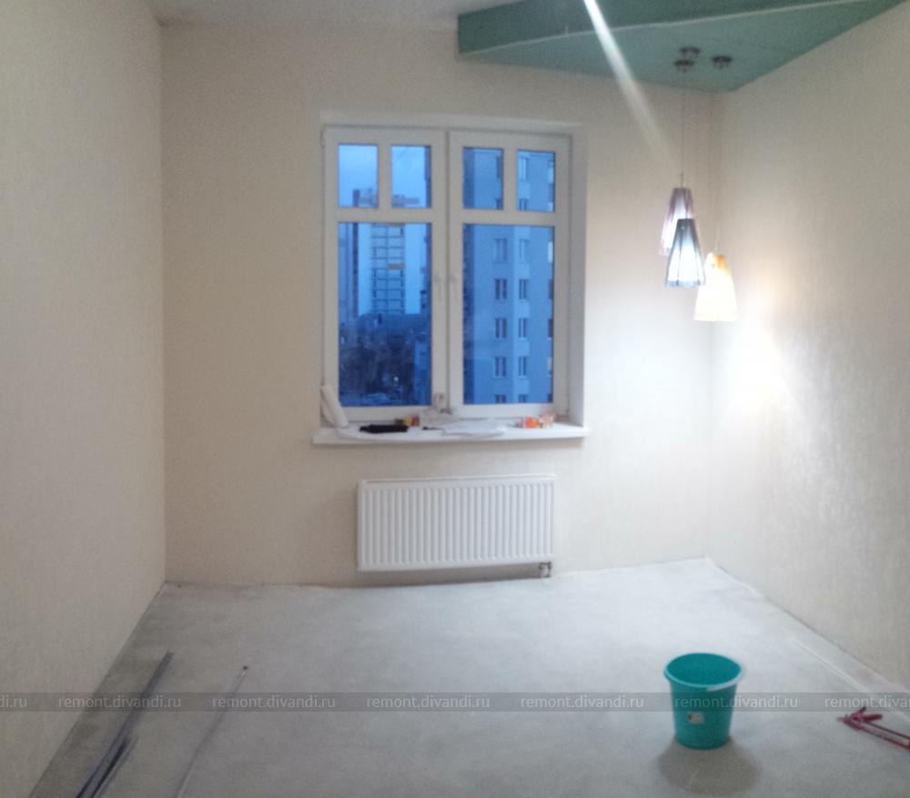 Какие работы были выполнены: Черновые отделочные работы по потолку и стенам, наклейка обоев, настил ламината, замена окна, радиатора, двери, замена электрики