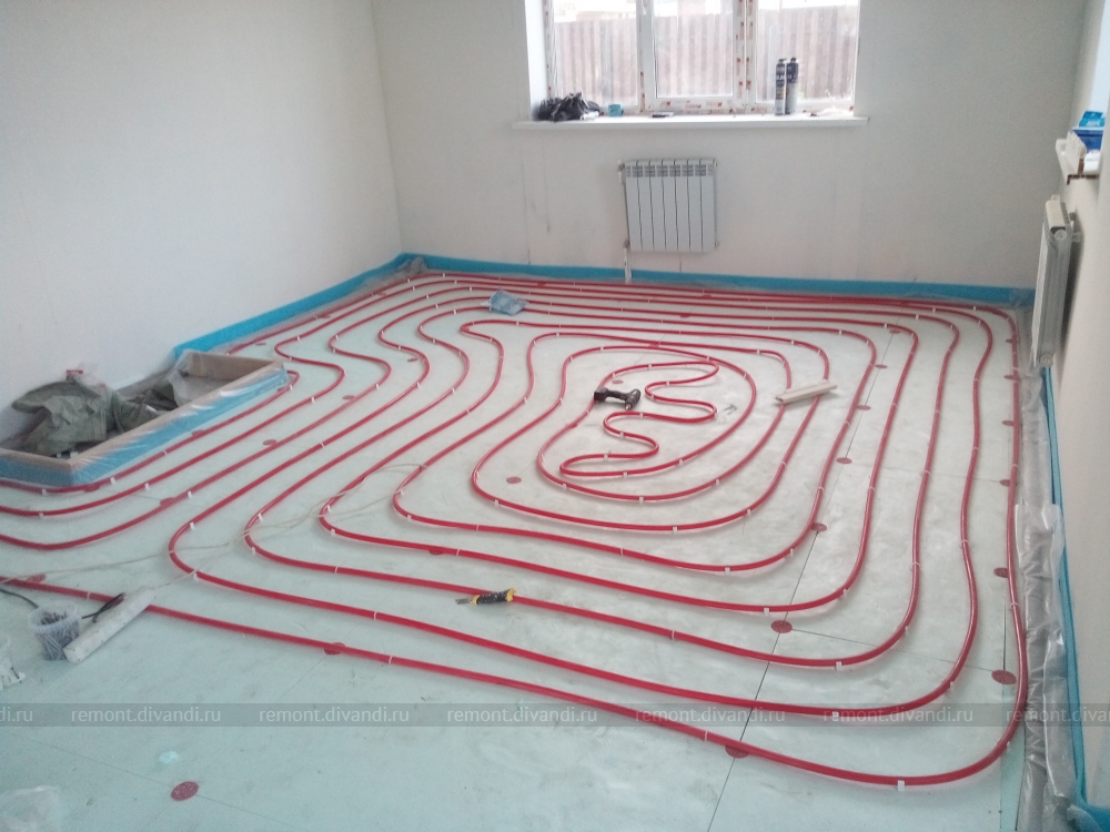 объем 50 м2, уложена труба, металлическая сетка, нужна сухая стяжка пола.