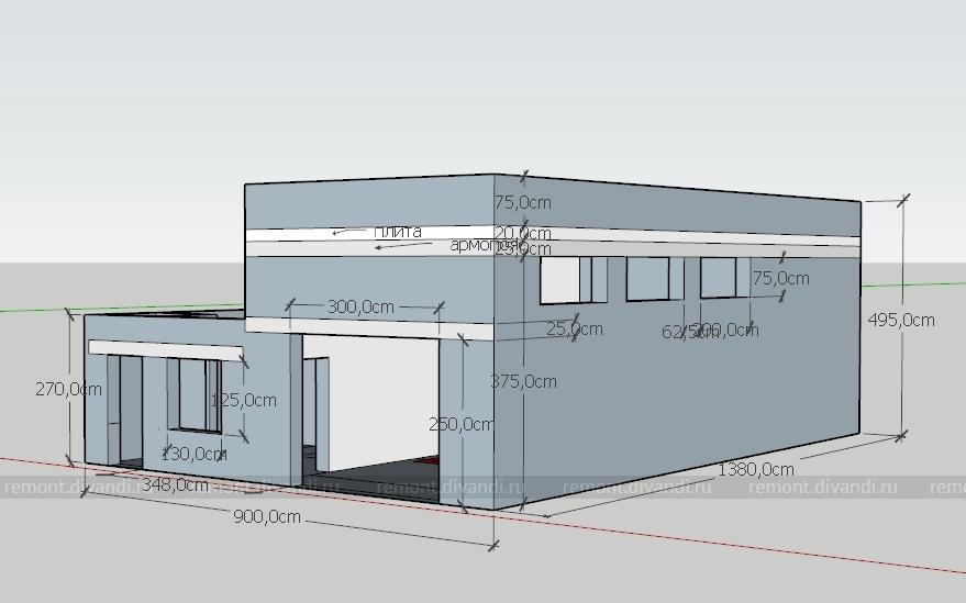 Гараж 14*5*5 м. Стены из пеноблока теплит 300*625*250. Общий объем кладки 62 м3, монтаж армопояса 63 м/п, перемычек и плит. Кладка на клей с армированием каждые два ряда стеклопластиковой арматурой.