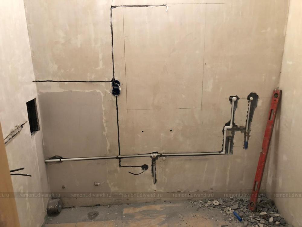 Из доработки по сантехнике надо из соседнего помещения (туалет) привести холодную воду (Сейчас проведена только горячая - пластиковая труба от левой стены идёт с водонагревателя)