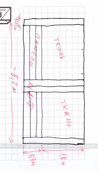 Нужно смонтировать настенные панели МДФ в сочетании с тканью (см. схему для больших стен). Без обрешетки, на саморезы непосредственно к стенам.