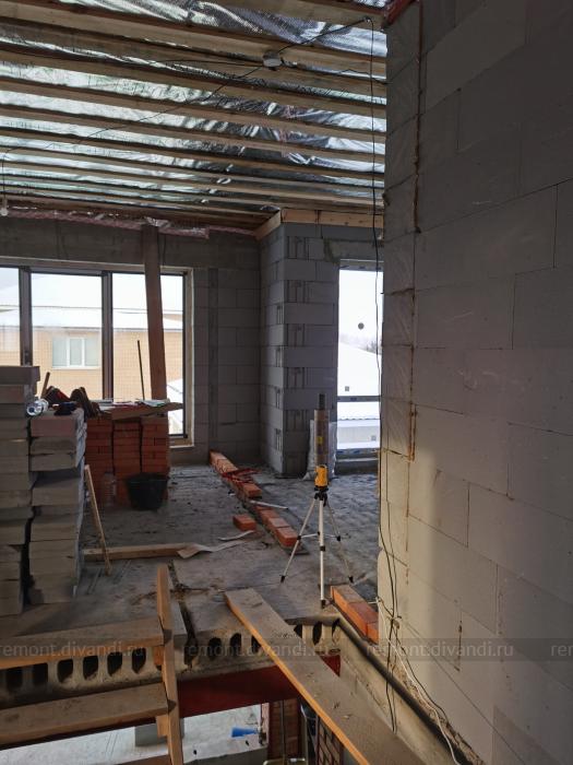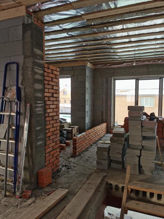 Кирпичная кладка общая длинна 16 метров, высота 3.3, 3 дверных проёма, кладка частично выполнена, процентов на 10-15. Кладка в 0.5 кирпича.