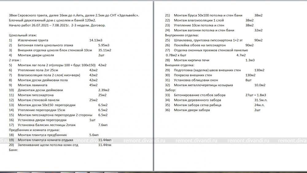 Двухэтажный дом с цоколем и баней 122м2. Работы по цокольному, 1, 2 этажу, бане. Бетонирование цоколя, утепление межэтажного перекрытия, бани, внутренняя и внешняя отделка, монтаж забора на участке. Подробности в файле.