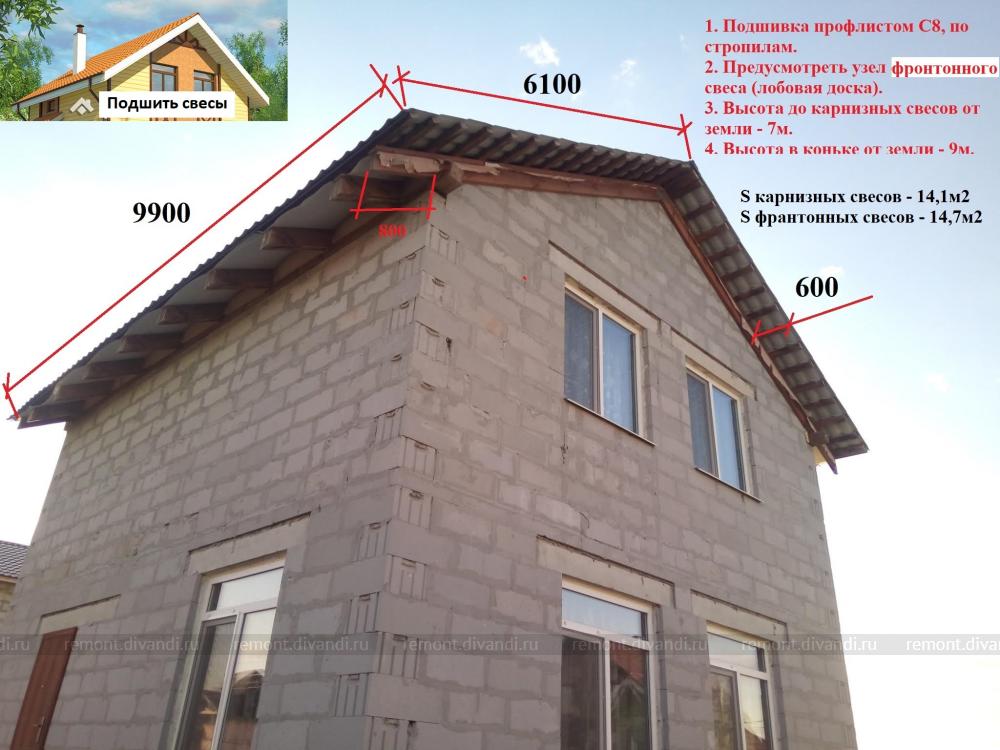 Необходимо подшить свесы двухскатной кровли (карнизные, франтонные) профлистом (площадь карнизных свесов 14м2, франтонные свесы - 14,7м2. Есть 4 секции лесов (рамных). Высота карнизных свесов - 7м. Высота конька 9-9,5м. Фото с описанием в приложении.