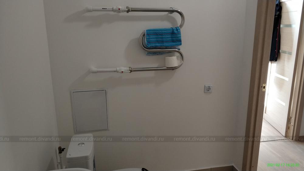 Монтаж теплого пола, монтаж кафельной плитки на стены и пол, экран под ванну из керамической плитки, монтаж разводки от пола под водяной полотенцесушитель, монтаж полотенцесушителя, добавление одной розетки.