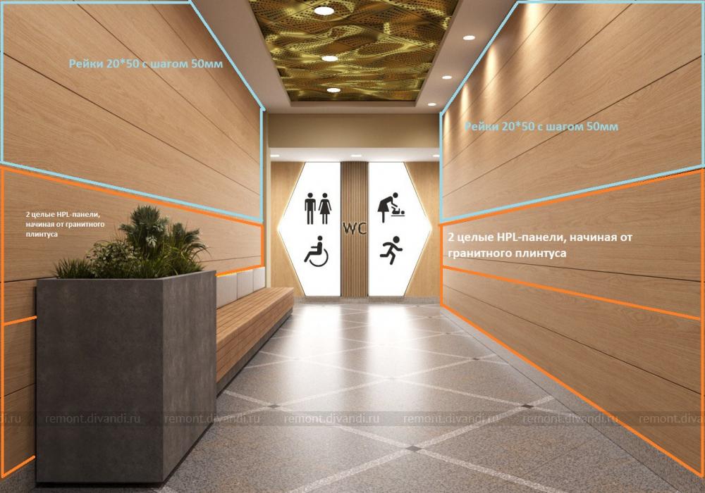 3. Монтаж реек из HPL 20*50 – шаг реек 50мм (раскладка указана в ТР Развёрточный план и развёртки стен коридора);
