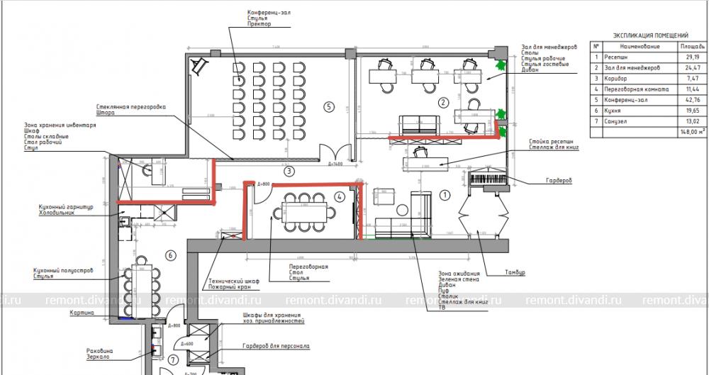 Прикреплю файл с планом офиса и отмеченными стенами, которые необходимо возвести.