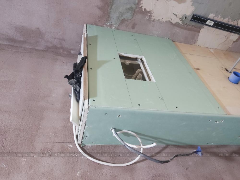 Наклеена плитка на полу, собран короб инсталляции, видимые трубы спрятаны в также в короб. На стене наклеяно два ряда плитки.