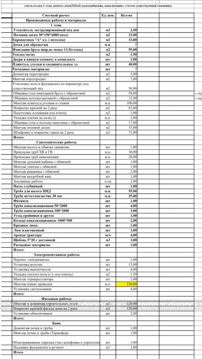 Объем работ в дачном доме (36м) и бане , согласно смете:
