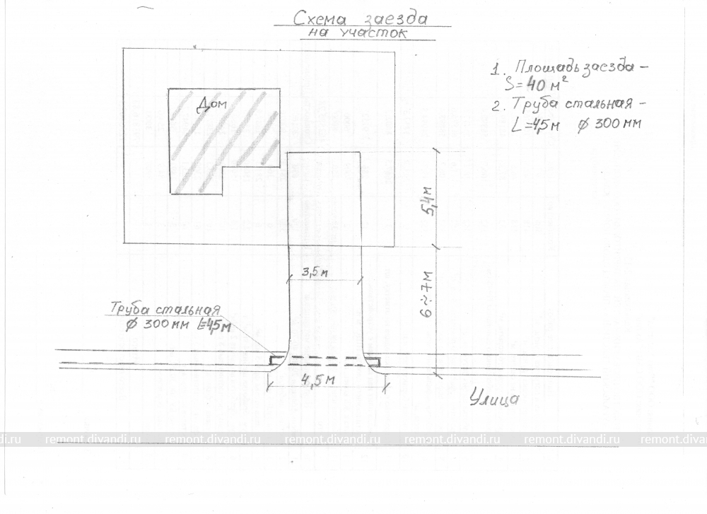 Организация заезда: оборудовать "корыто" глубиной примерно 20-30 см, уложить трубу в канаву водоотведения, засыпать скальником и мелким щебнем, утрамбовать.