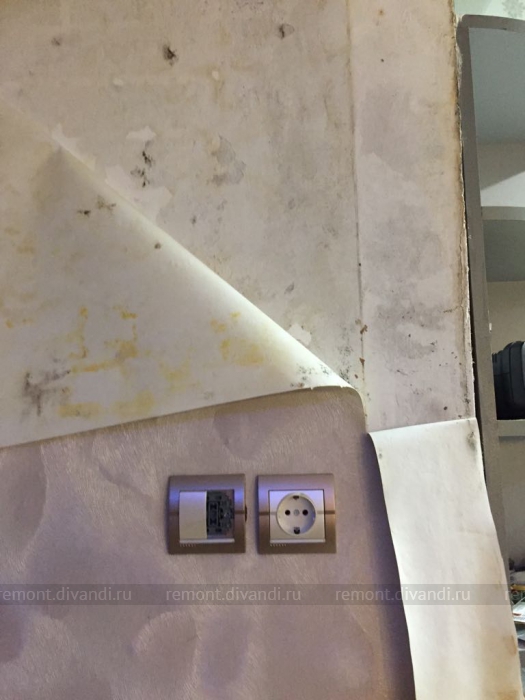 Требуется очистка плесени и поклейка обоев. Размер стены 2.5м x 2.3м