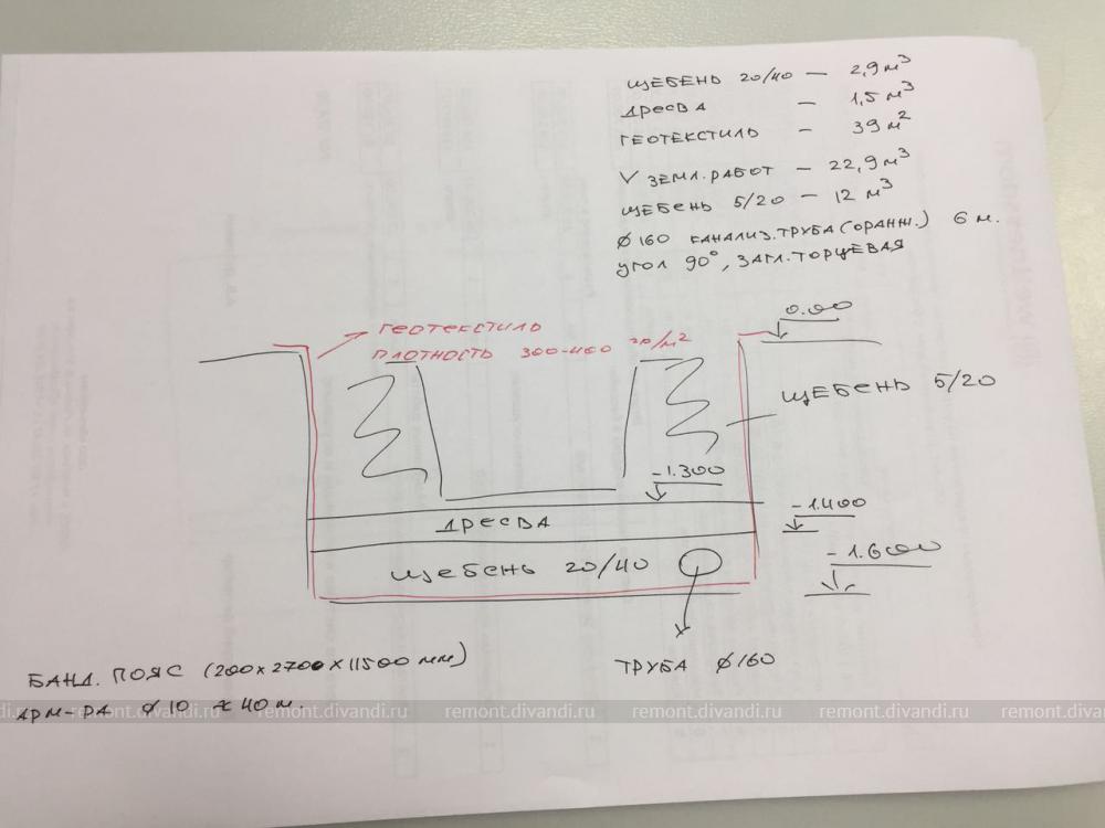 Копка котлована, установка коммуникаций, укладка геотекстиля, подготовка подушки, обратная засыпка щебнем, бандажный пояс.
