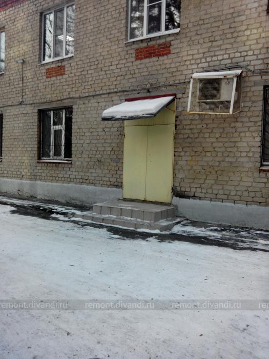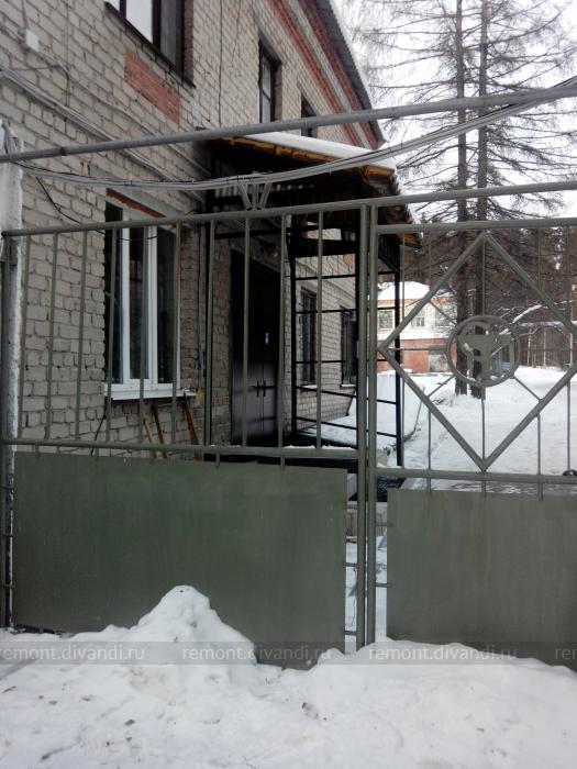 Ремонт крыльца у здания 3 шт. Залить бетон, установить крышу металлочерепица, на ступени уложить керамогранит.