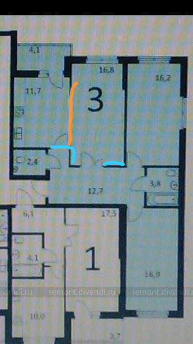 Необходимо демонтировать несколько перегородок из гибсовых блоков как отмечено голубым на фото 1 (оранжевым уже нет) и возвести так же из гибсовых блоков перегородку как на фото 2 её необходимо зашпаклевать и оштукатурить со стороны комнаты.