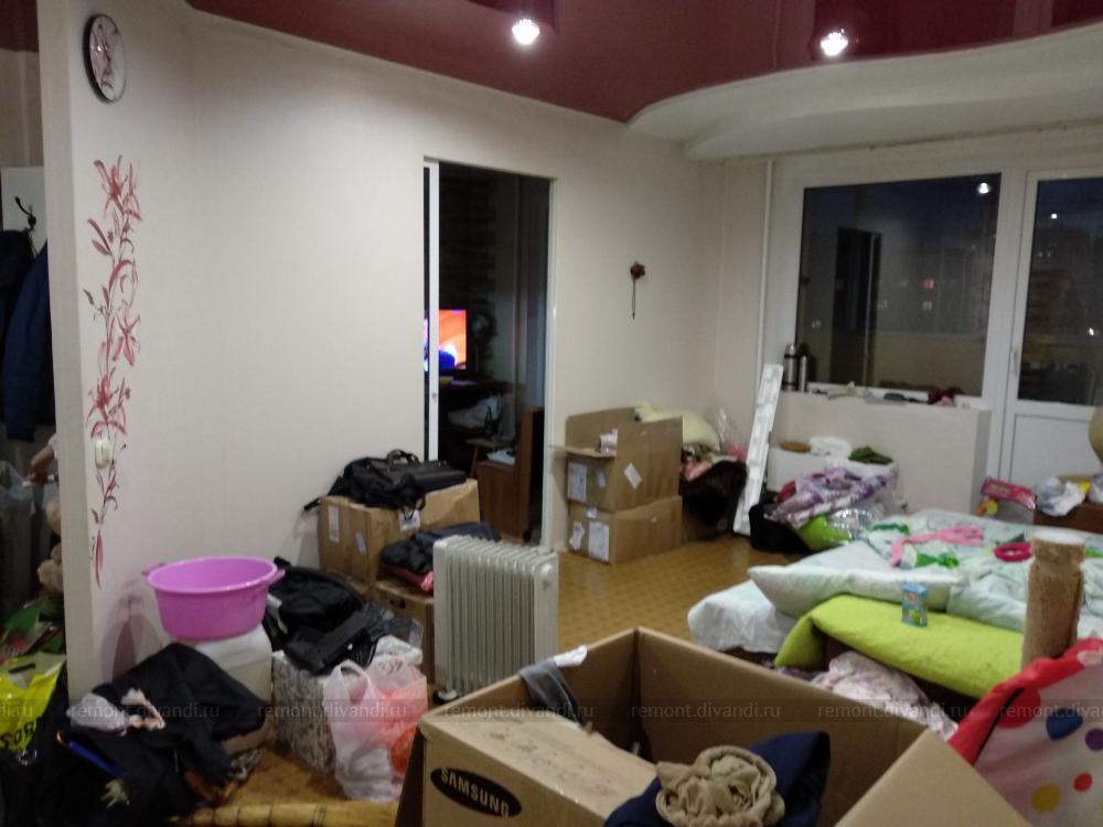 Демонтаж перегородки между кухней и гостиной (в обоих помещениях натяжные потолки), возможно монтаж новой перегородки меньших размеров, перенос розеток и выключателя. Уложить напольное покрытие (ламинат или линолеум- нужна консультация), возможно достроить короб на потолке, чтобы скрыть последствия сноса перегородки.