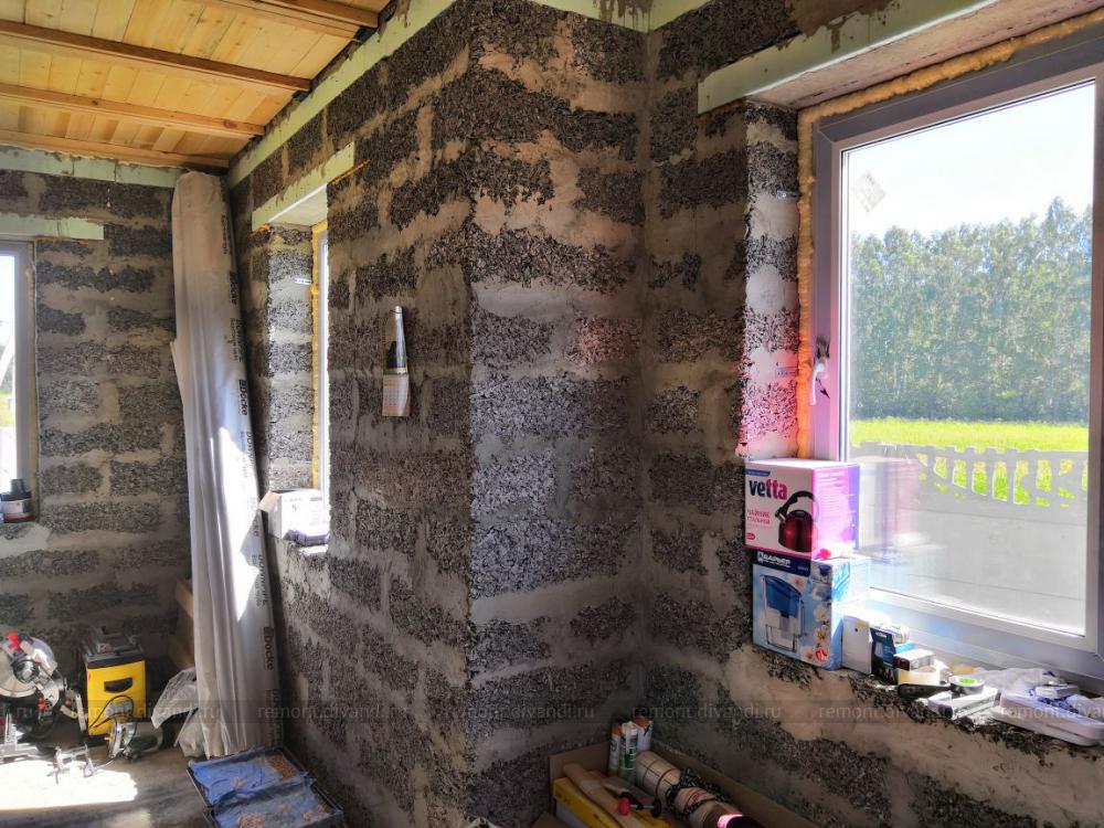Штукатурка стен из арболита. Обычная, визуально ровную плоскость, без маяков. С дверными проёмами. Стены внутри помещения коттеджа. Примерная площадь стен 200 м2. Объект в коттеджном посёлке удалённостью 15 км от Екб по Полевскому тракту