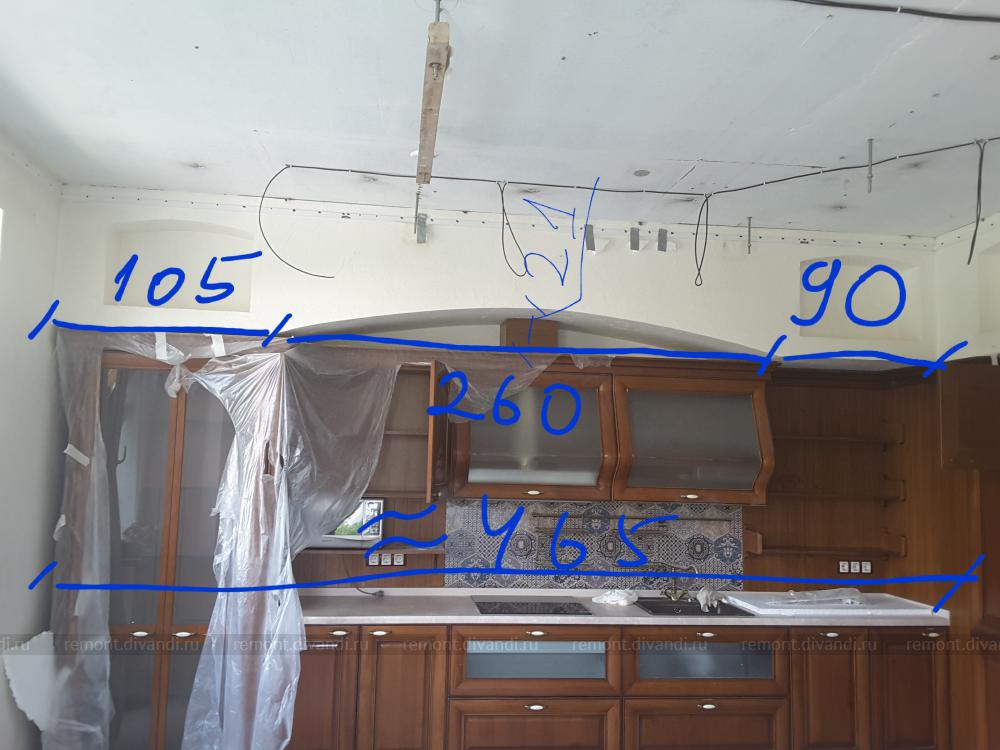 2) короб с аркой над кухонным гарнитуром. Надо повторить то, что на втором фото. Короб со сторонами менее 600 мм - расчёт 130 р / м.п. за сторону короба. Здесь 2 стороны. Арка включена в расценку... ниши справа и слева - по 700 р / м.п., их 3 шт будет таких. Общая стоимость работы 5000 рублей