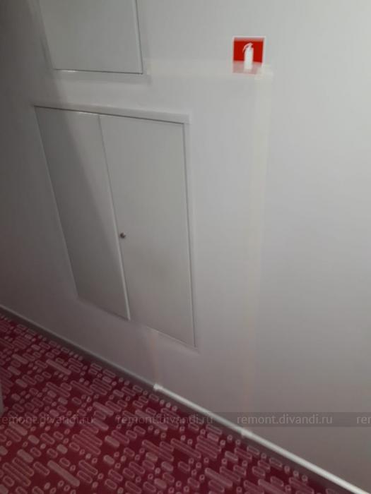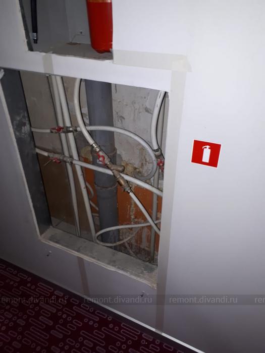 На 5-и этажах технические ниши стояка закрыты стеной, выполненной из гипсокартонных панелей. Обслуживание системы водоснабжения и канализации осуществляется через проём в стене. На 3-х этажах в проёмы встроены люки. проём расположен на высоте от 20 см до 50 см от уровня пола. По полу около стены проложен плинтус.