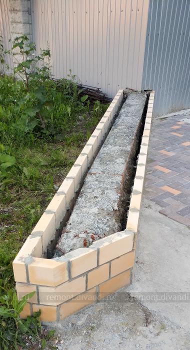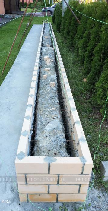 Старое бетонное основание забора обнесли кирпичом. Пустоту надо залить бетоном. Бетон привезу.