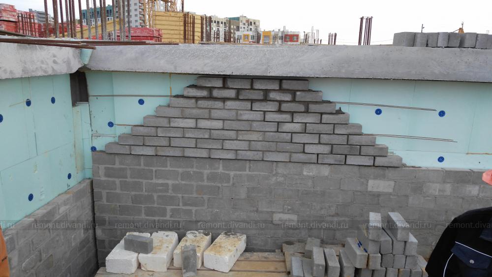 Кладка цоколя, бетонным кирпичом, под расшивку.