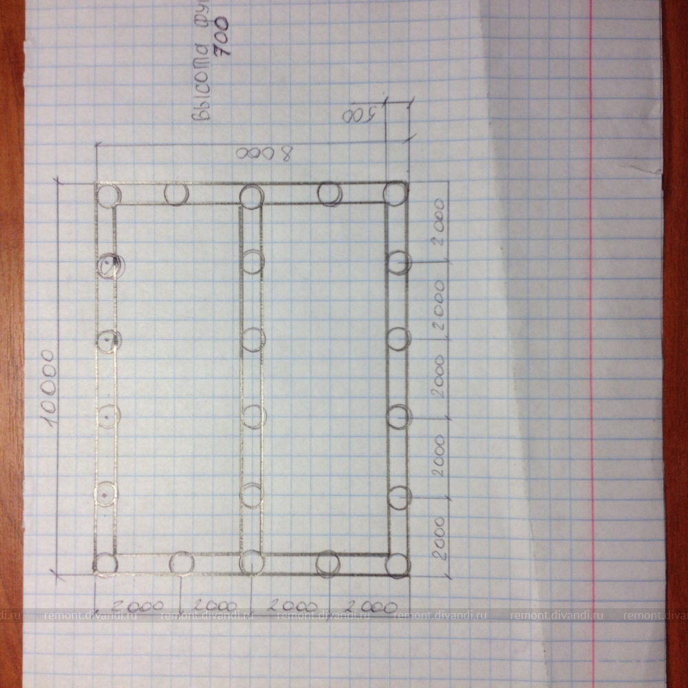 Фундамент 8*10 метров, ленточный со сваими. Ширина ленты 50 см высота фундамента 70 см. Интересует цена за работу с вашим материалом