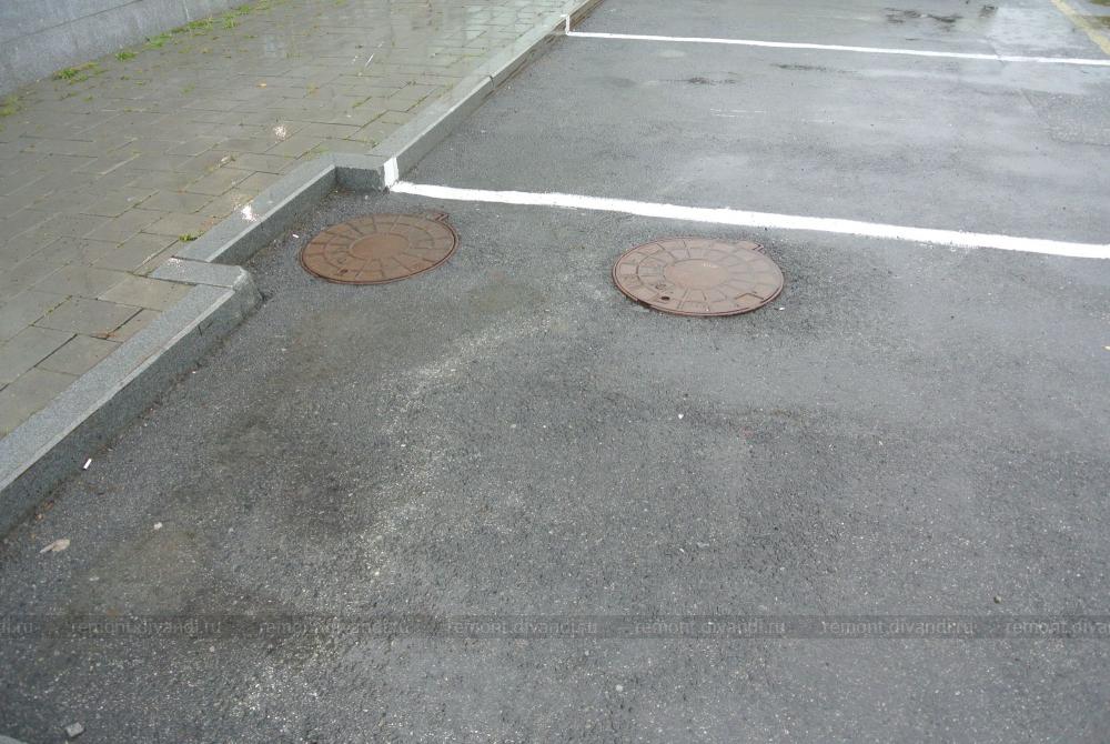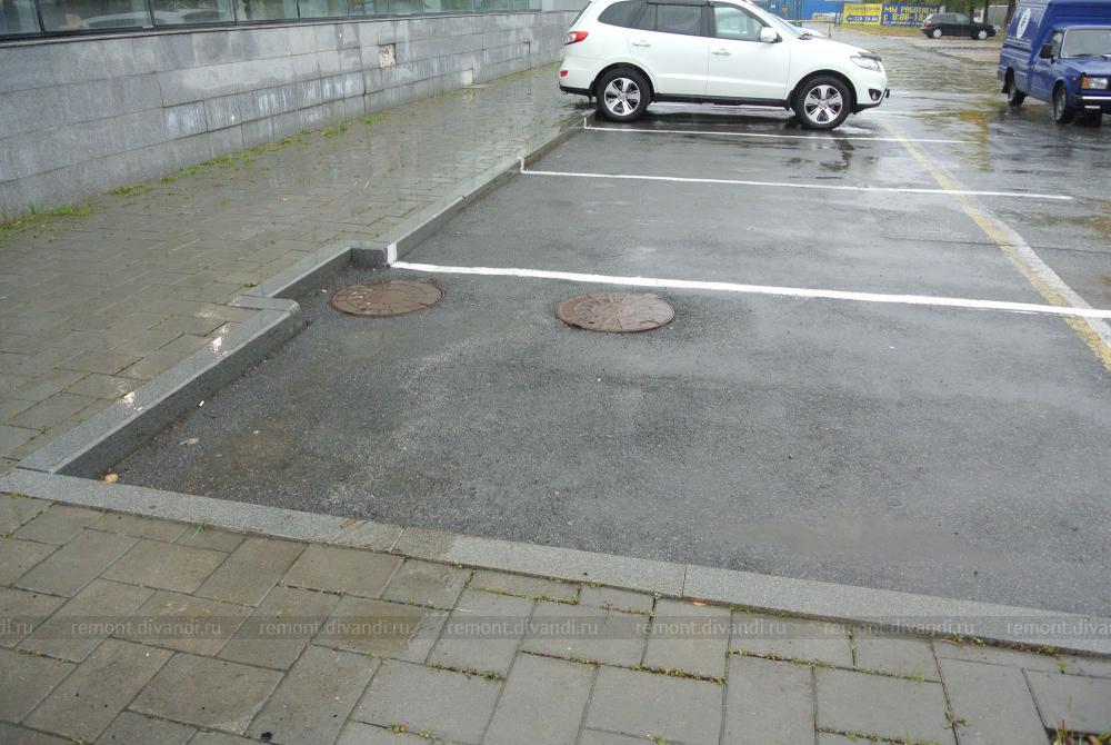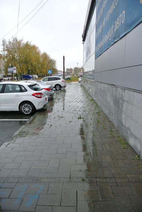 Укладка бехатоновой плитки на месте существующего асфальтированного кармана с повышением уровня на 140 мм S = 82,14 м. кв ( до уровня уже существующего уложенного рядом бехатона ) - таким образом, выполняется расширение тротуара;
