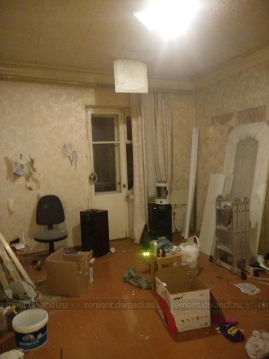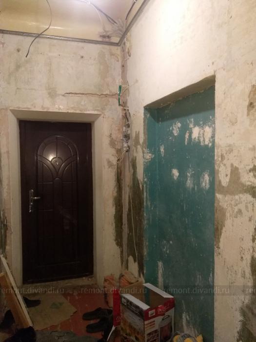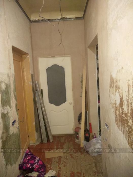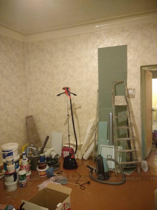 Монтаж двери, подготовка стен под обои (удаление старых обоев, выравнивание штукатурной смесью, без шпатлевания). Поклейка обоев (стекловолокно). Окраска обоев, чугунной батареи, без снятия старого покрытия, балконной двери с подготовкой.