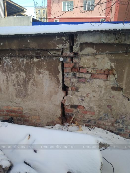 Необходимо оценить возможность восстановления задней стены гаража, потребуется или нет дорабатывать фундамент. Сейчас между боковой и задней стеной щель в 70мм