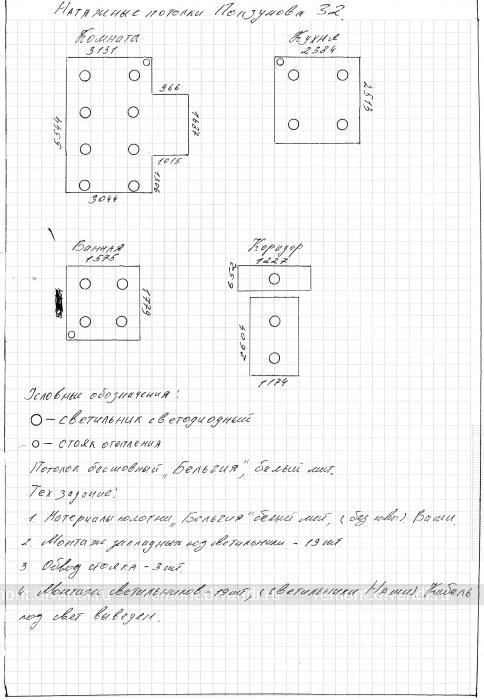 Нужно смонтировать натяжные потолки в четыре помещения: Комната, Кухня, Ванная комната, Коридор. Все работы в одной квартире. Полотно ваше, полотно Бельгия, белый мат, без швов. Монтаж закладных под светильники 19шт, обвод стояков отопления 3 шт. Светильники светодиодные: установочный размер 120-130мм., светильники наши. От вас качественный и безопасный монтаж. Монтаж нужен желательно завтра 26.11.18г. Фото плана потолков прикрепляю.