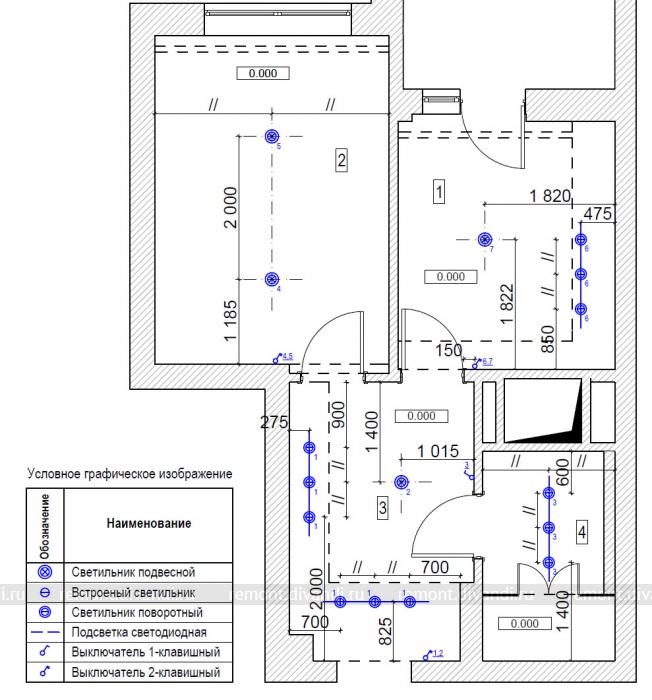 В коридоре, на кухне и в санузле надо переместить люстры.