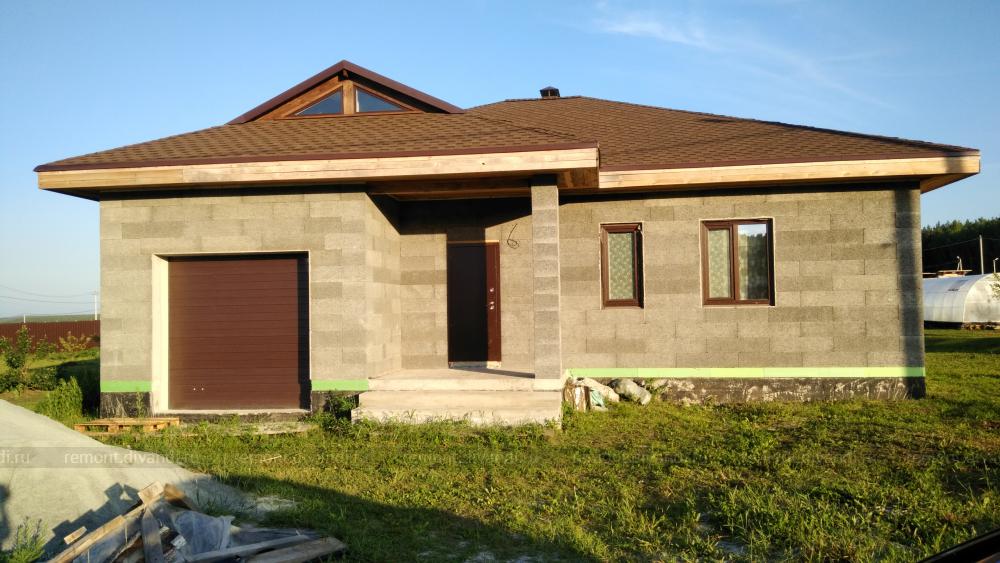 Дом одноэтажный, 40км К-Ур тракта (КП Александрия). Высота стен до 3.5м. Площадь фасада без проемов 158м2. Проемы: 1 гаражные ворота, 2 дверей, 9 окон. Для окон необходимо сделать откосы (утоплены на 10 см) и отливы. Длина откосов - 48 м.