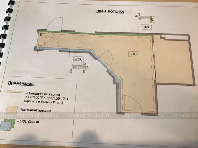 Создание потолочного короба из гипсокартона, длина 15,8 м ширина 12 см. Монтаж на этот короб карниза плюс на другие стены периметр где-то 23 метра. Окраска короба и карниза в два слоя. Оклеивание стен обоями где-то 30 м2.