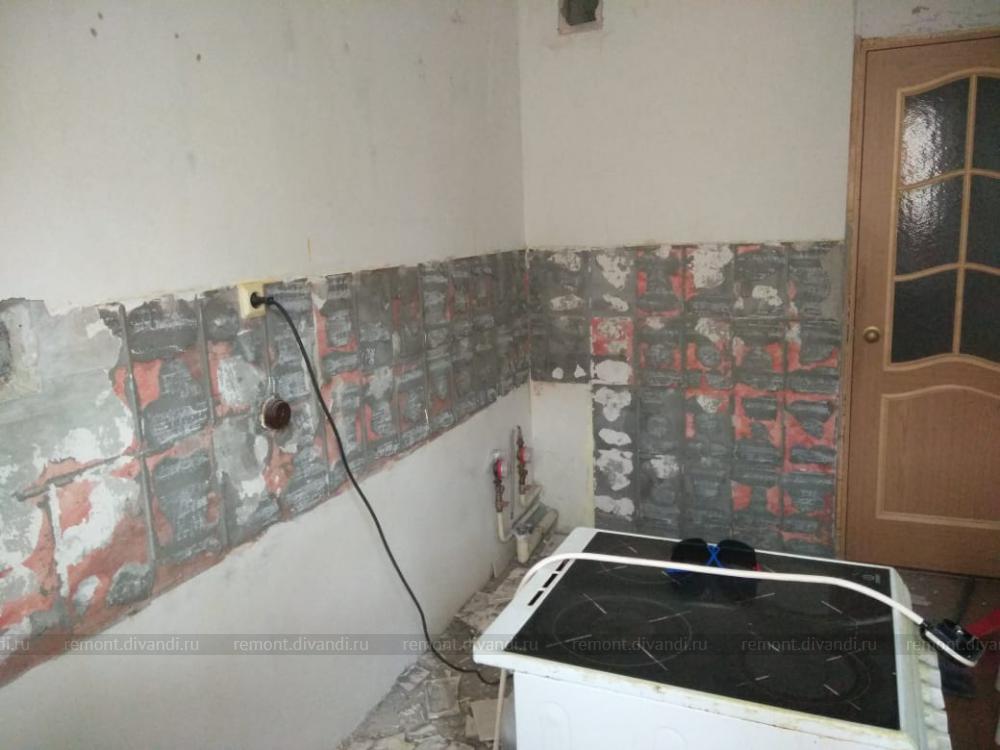 После снятия кафельной плитки на кухне необходимо подготовить стены под поклейку обоев.